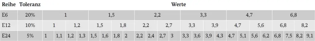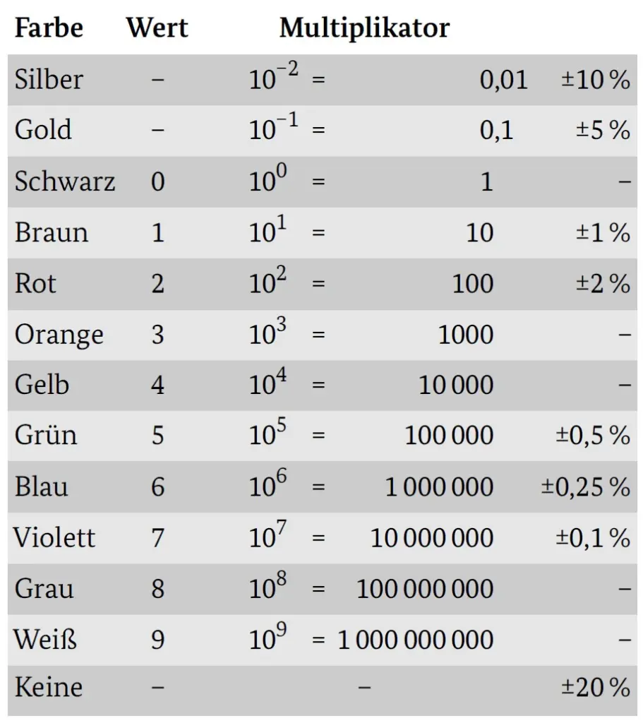 Die nachfolgende Tabelle zeigt in den Zeilen die möglichen Farben bei der Kennzeichnung von Widerständen. Wobei die Farbkennzeichnungen für die Wertigkeit (0 – 9) und den Multiplikator vorhanden sein müssen. Lediglich der Farbring für die Toleranz kann auf einem Widerstand fehlen. In diesem Fall hätte der Widerstand eine Toleranz von ±20%.